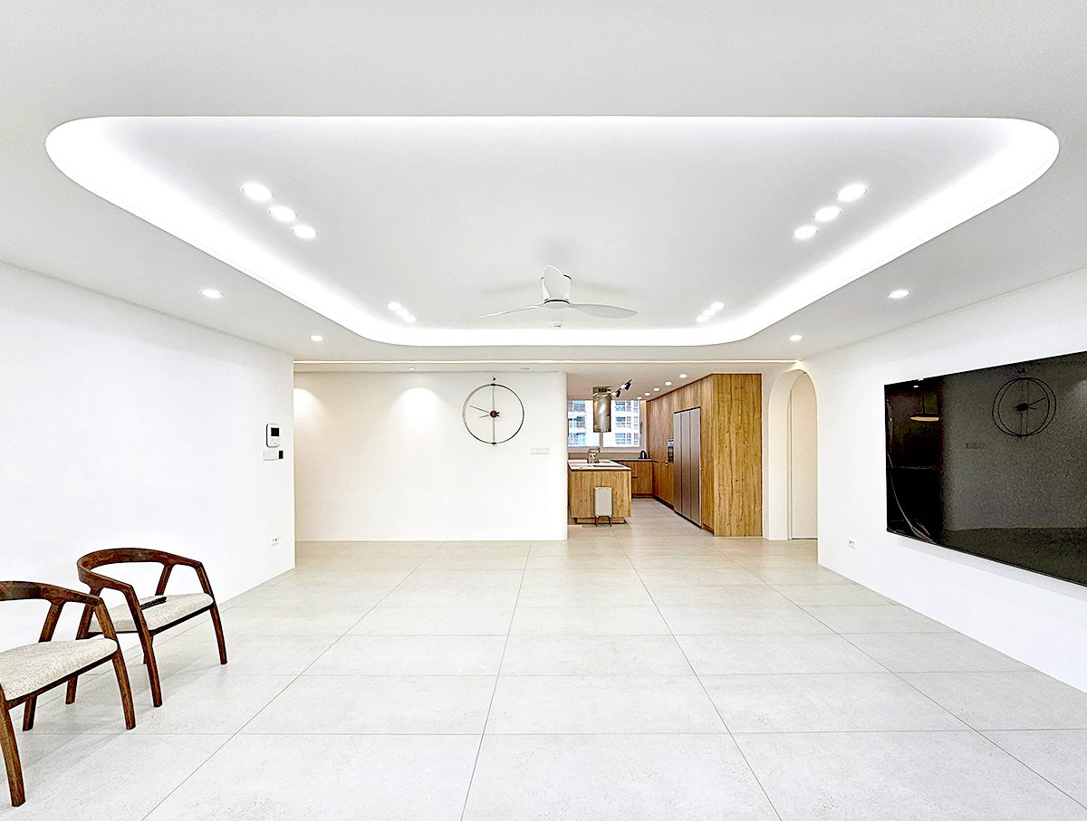 우물천장과 실링팬, 포인트 조명으로 호수뷰와 어우러진 감성적인 거실