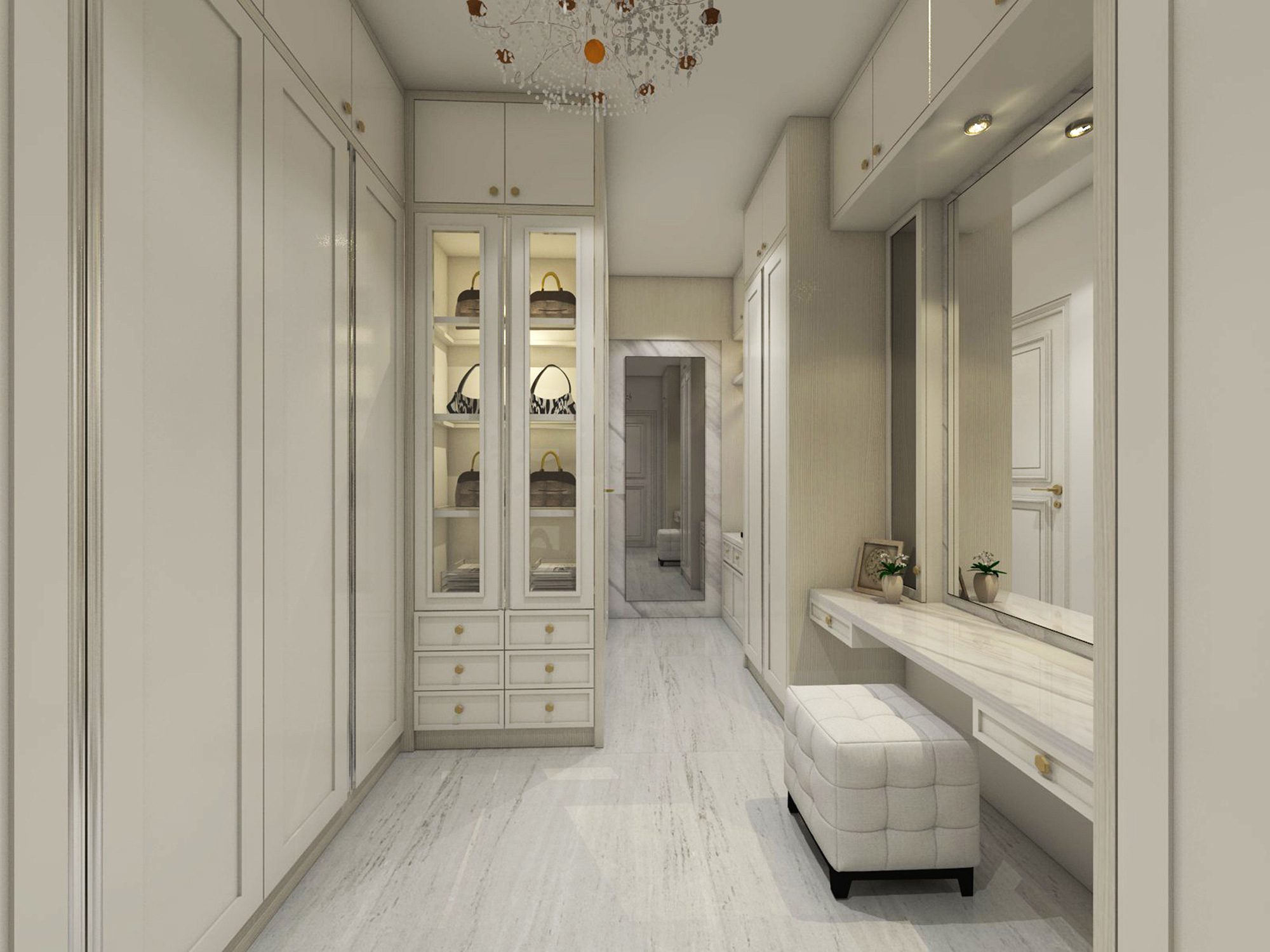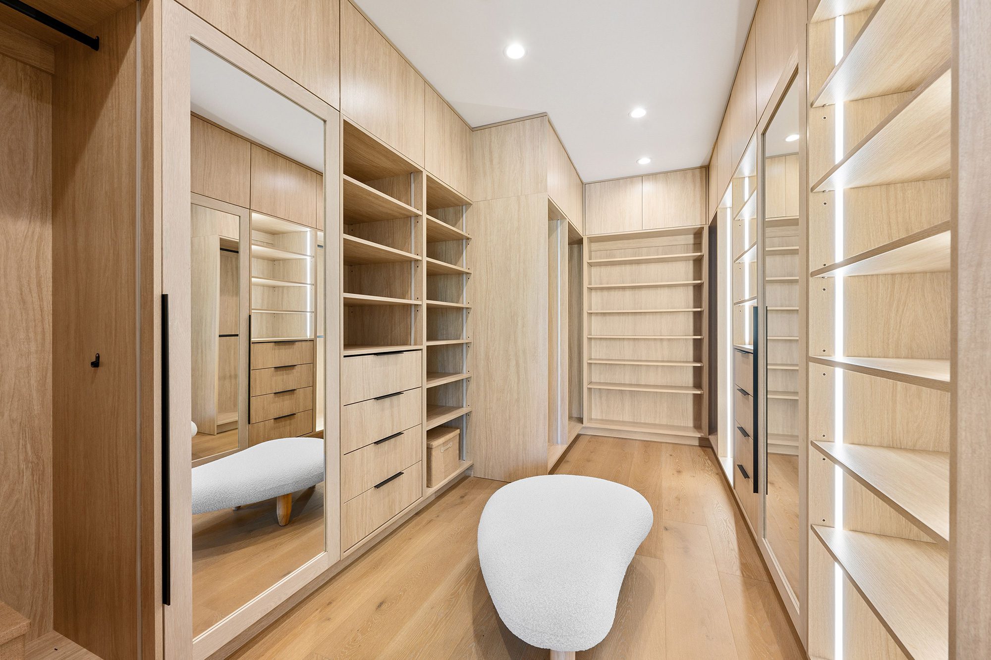드레스룸이니 만큼 거울은 대체적으로 배치가 되어 있겠지만, 스툴의자를 하나 배치하여 앉았을 때 변하는 옷의 주름등을 확인하여 좀더 디테일한 스타일링을 할 수 있게 도와줄 수 있습니다.