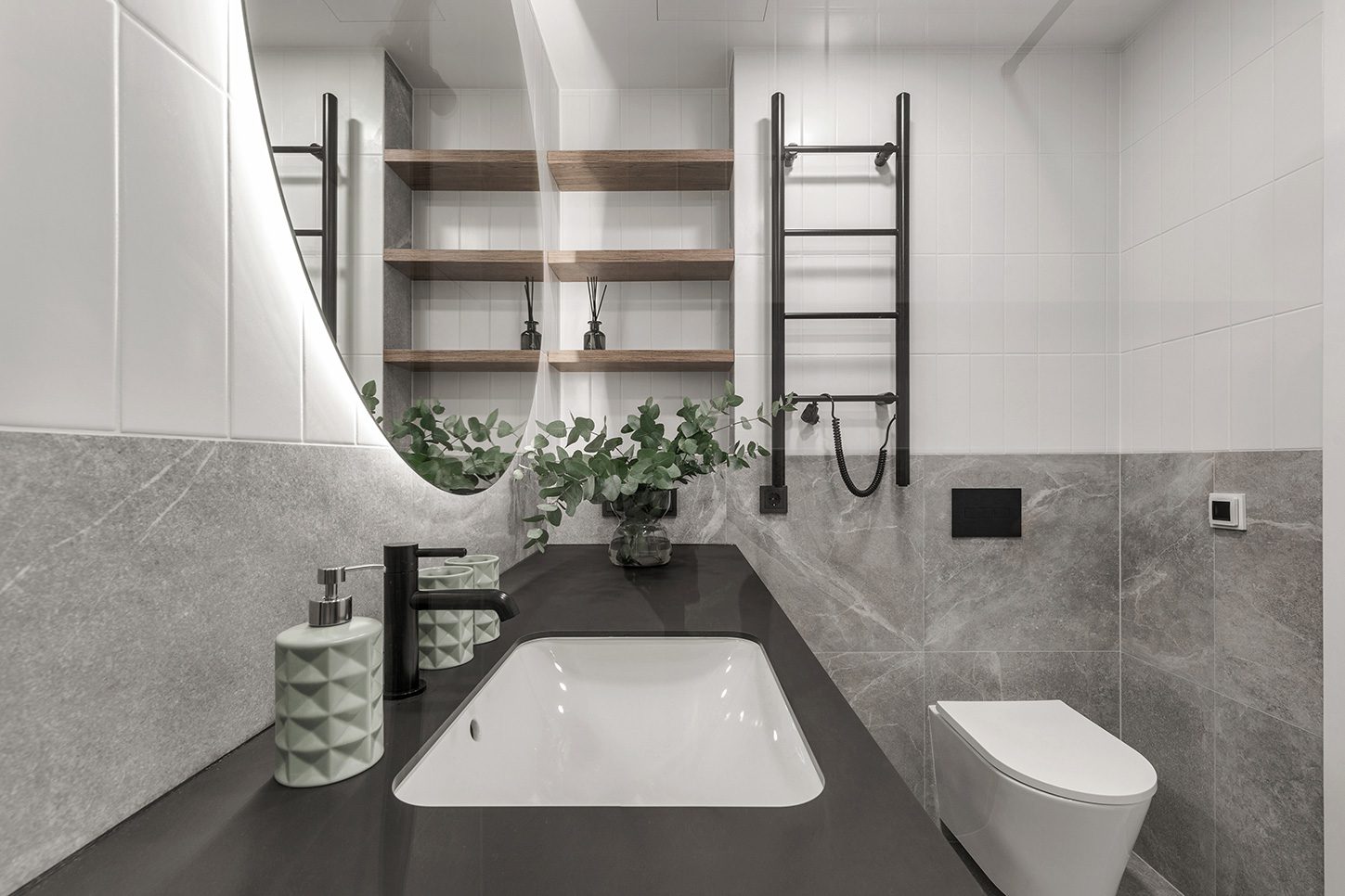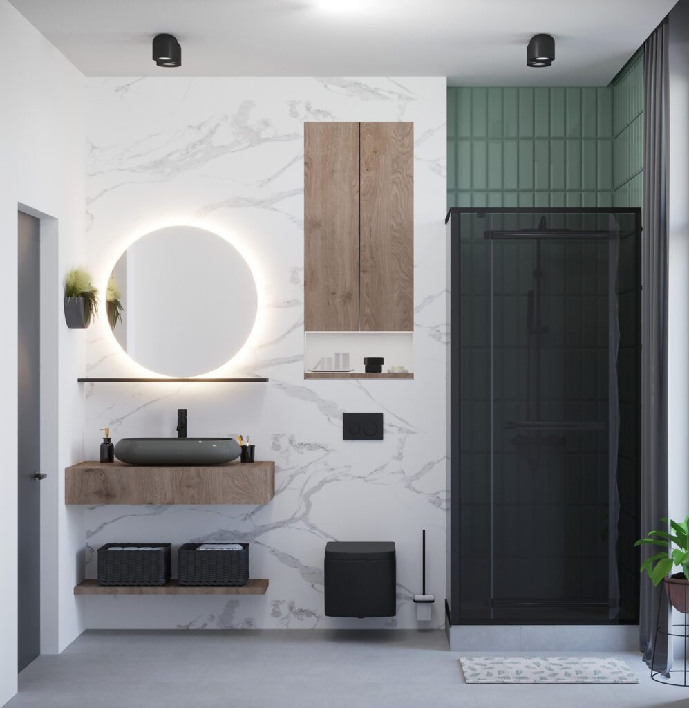 전체적인 톤을 살리고자 하는 분위기에 맞춰 정리하고, 수전이나 수건걸이, 그리고 소품에서 포인트 컬러를 활용하여 디테일로 공간의 가치를 높여주며, 스마트미러나 자동 온도조절 샤워기 같은 스마트 솔루션도 점점 보편화 되고 있는 추세입니다.
