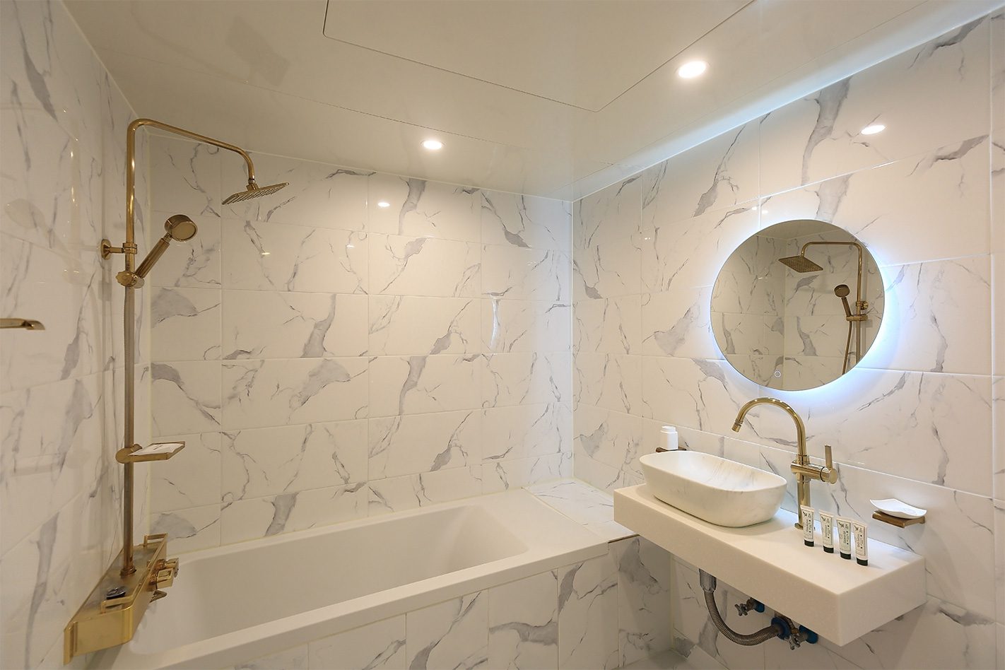 대리석에 톤온톤 타일을 활용하여 시각적 연속성을 만들어내는 방식이 자주 활용되고 있으며, 간접조명과 거울조명은 따뜻한 무드를 일상으로 가져오는 대표적인 사례라고 볼 수 있습니다.